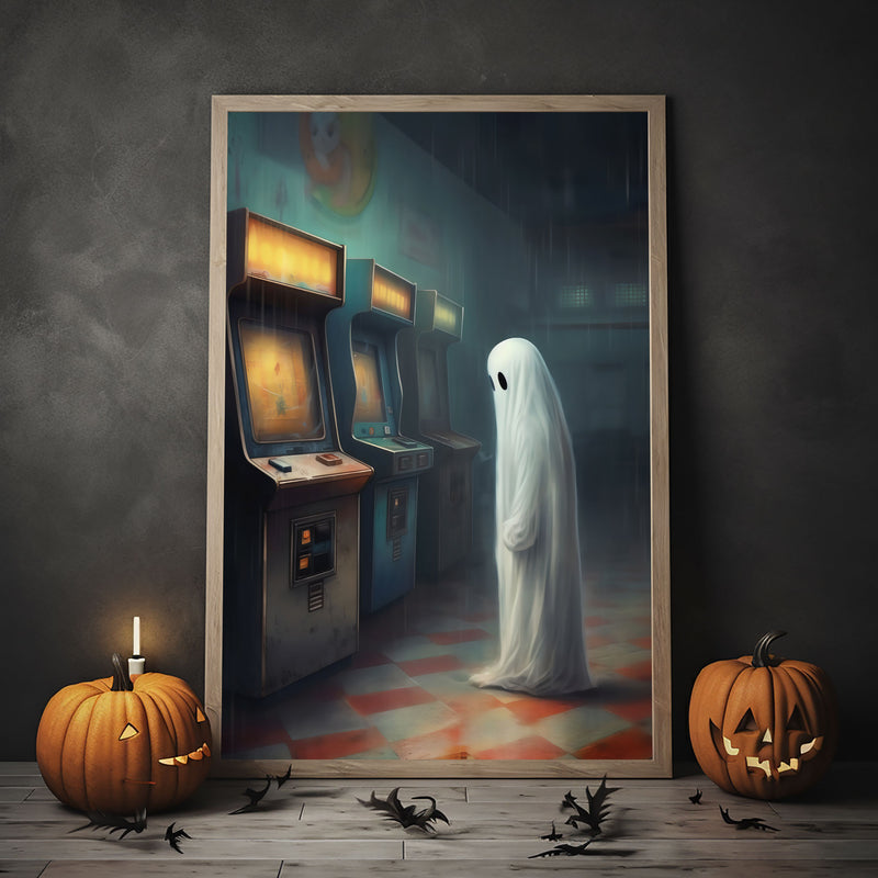 Ghost In An Abandoned Arcade, Halloween Poster, Art Poster Print, Dark Academia, Gothic Retro, Halloween Decor, Cute Ghost Poster